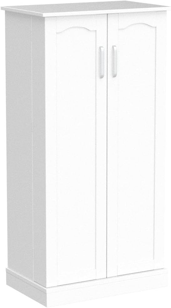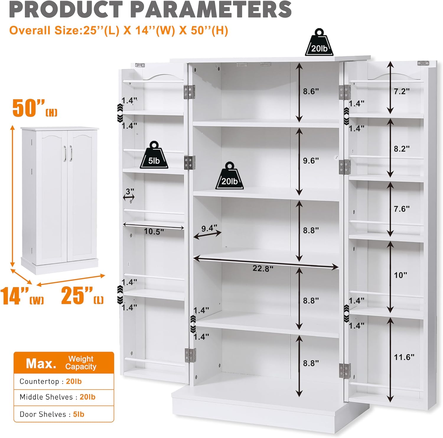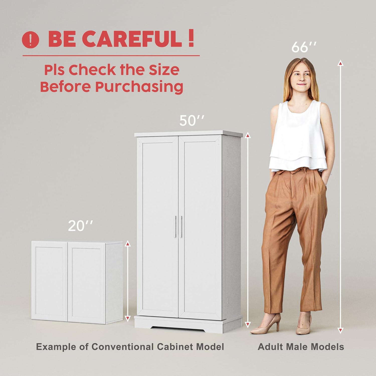 50" LED Kitchen Pantry Storage Cabinets - Standing Food Cabinets Cupboards with 2 Doors with Racks and Shelves Adjustable for Small Space in Dinning Room, Living Room, in White