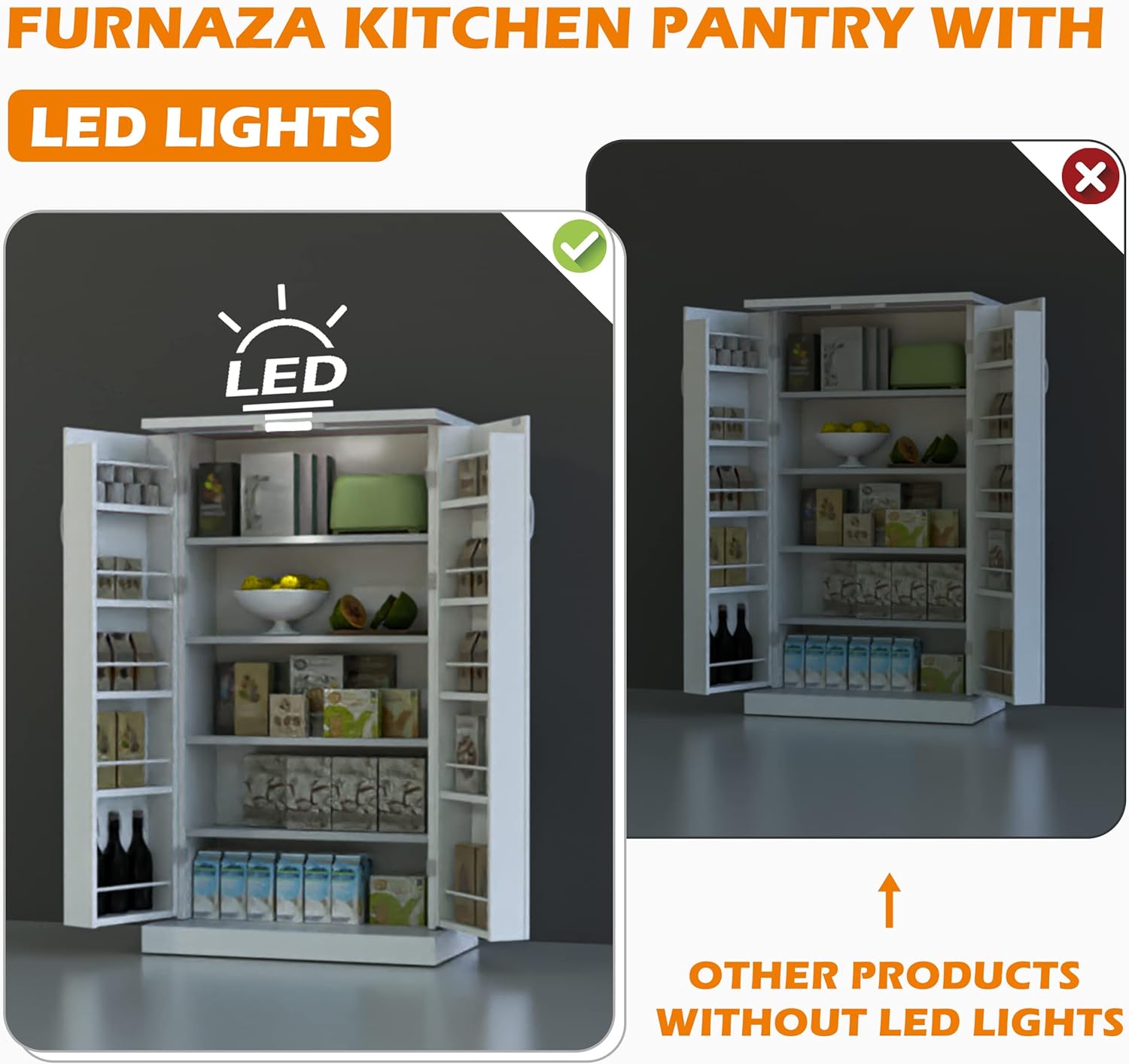 - With the Pantry cabinet built-in LED lighting, you can easily locate and retrieve your stored items, reducing clutter and creating a more organized space.