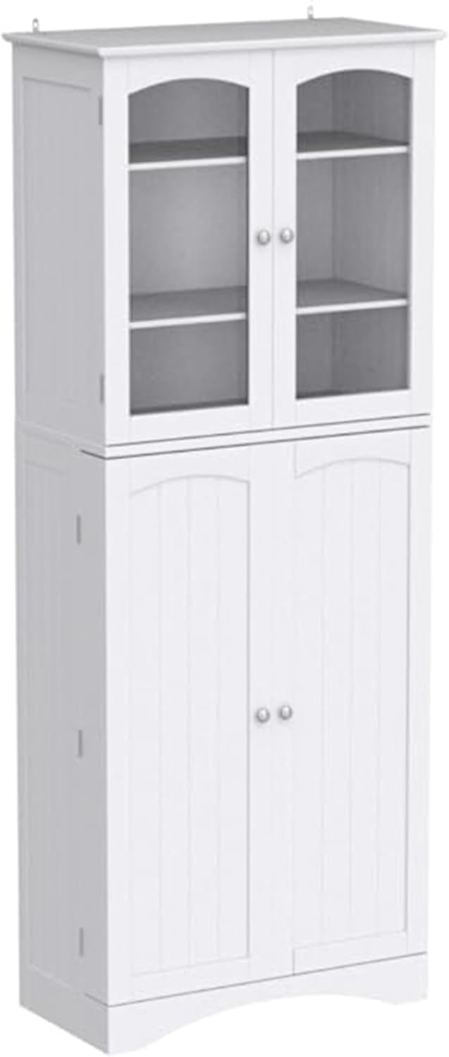 Gizoon 64" Kitchen Pantry Cabinet, Tall Storage Cabinet with Glass Doors and Adjustable Shelves, Freestanding Floor Cabinet Cupboard for Kitchen, Living Room, Dining Room (White)