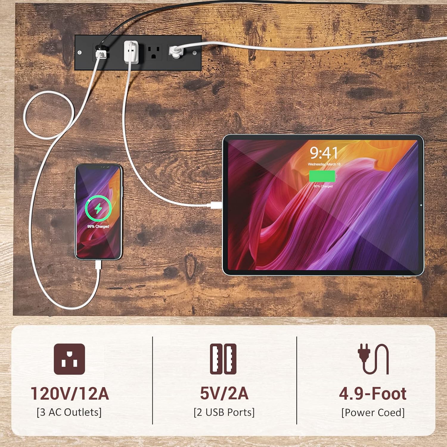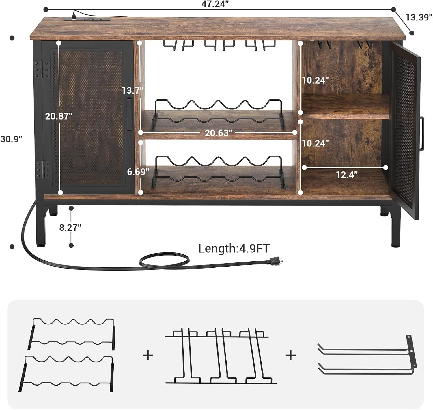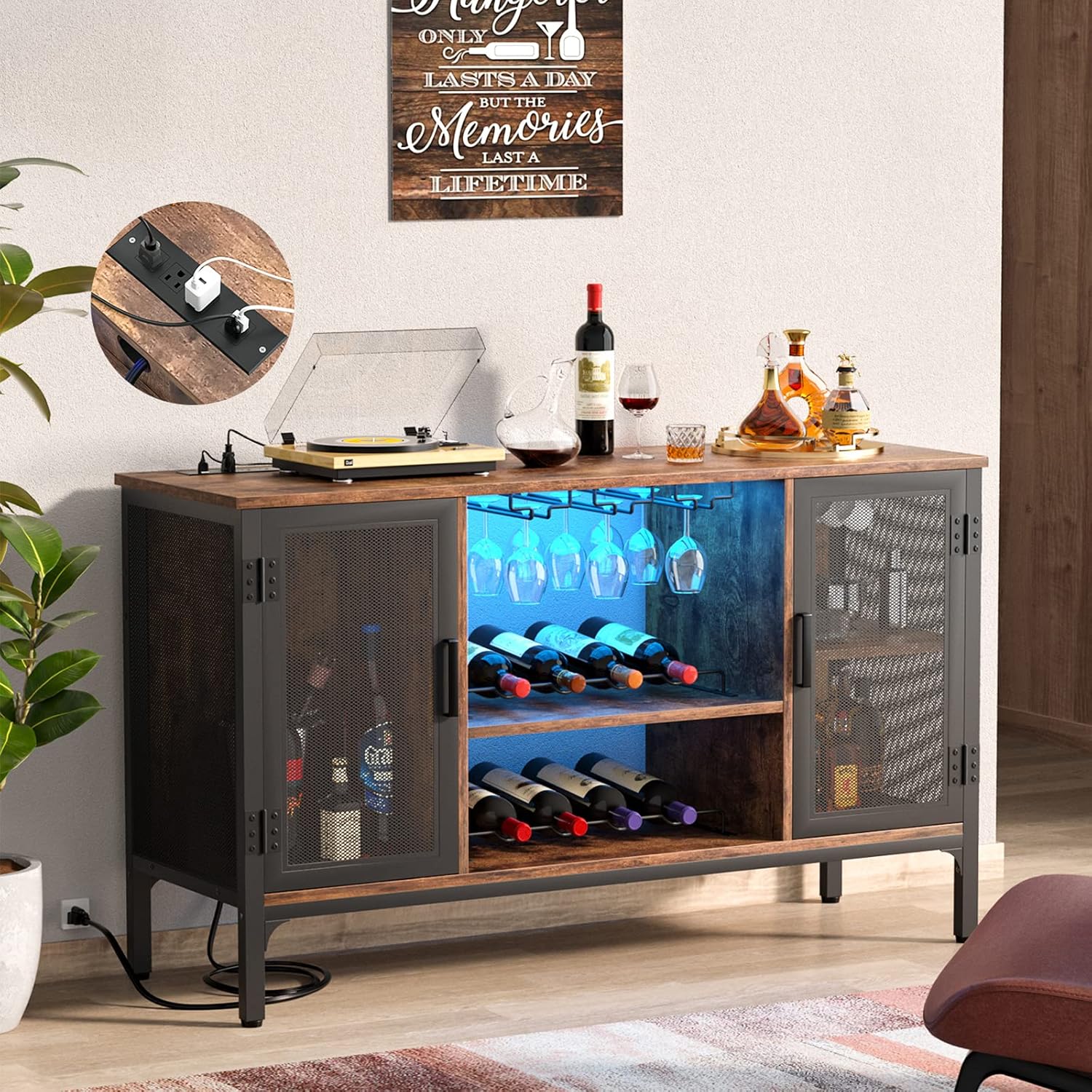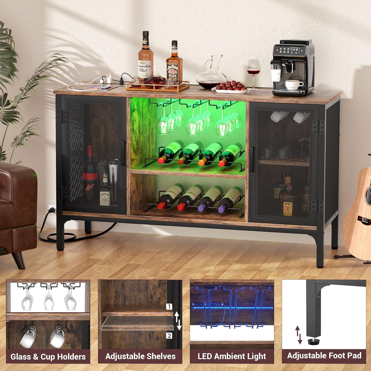Homieasy Wine Bar Cabinet with Power Outlets & LED Lights, Industrial Liquor Cabinet with Adjustable Wine Racks, Coffee Station Cabinets with Storage for Kitchen/Home, Rustic Brown