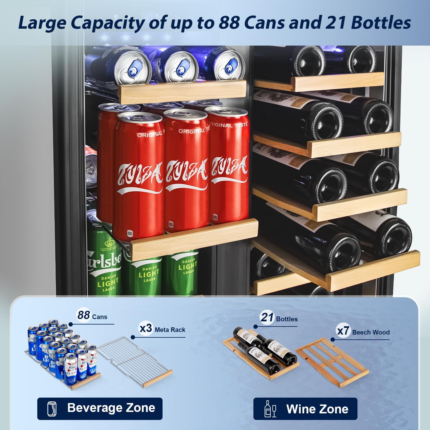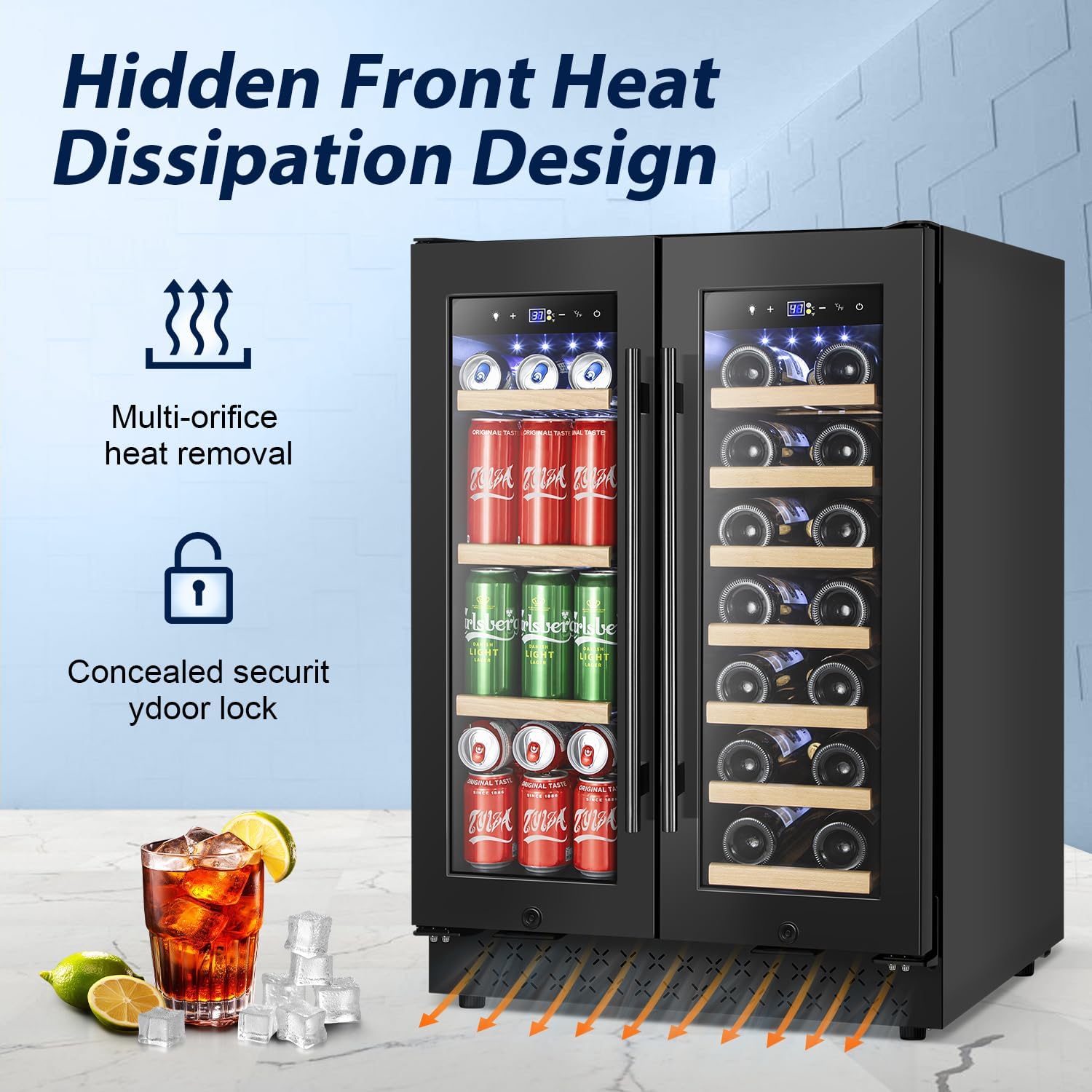 Tylza 24 Inch Wine and Beverage Refrigerator, Dual Zone Wine Beverage Cooler 24" with French Door, Under Counter Wine Beer Fridge Built-In or Freestanding, Holds 20 Bottles and 88 Cans, Black